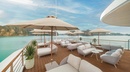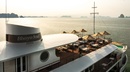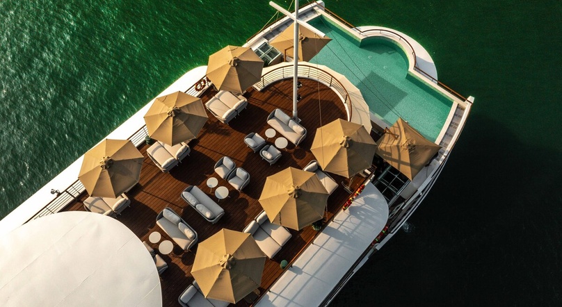 Limited to 20 spacious cabins (30-80m²), the 5-star cruise elevates luxury and comfort with the highest privacy and personalized service. The design is inspired by Vietnamese ceramics and the main striking blue color - a blend of land, sea and natural ecosystem of Halong Bay. The accommodation is environmentally friendly and ensures high-class comfort with modern amenities such as TV, minibar, air conditioning, wifi, etc. In addition, visitors will not be able to resist the moments of lying down on the sun loungers on the 5th floor, enjoying the majestic scenery as the ship glides on the water, or soaking in the four-season swimming pool and sipping a glass of favorite wine.