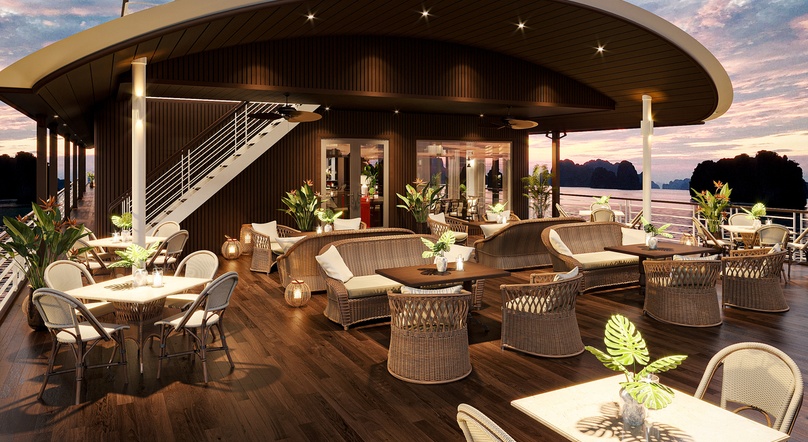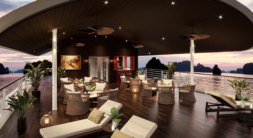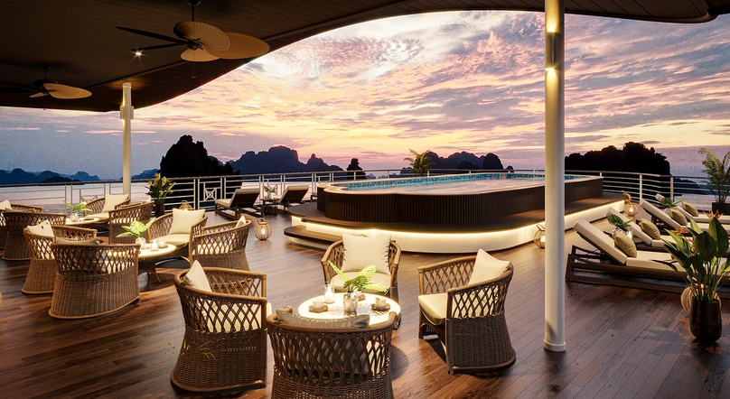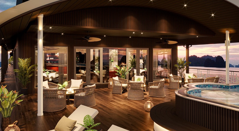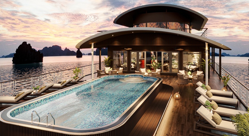 On board, traditional Vietnamese aesthetics meet refined Indochine elegance. Guests can expect panoramic dining on the upper deck, a rooftop pool with uninterrupted bay views, a serene spa sanctuary, and a stylish sunset lounge.